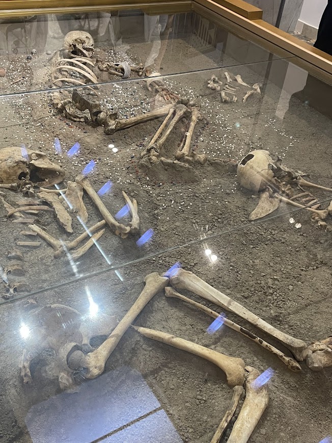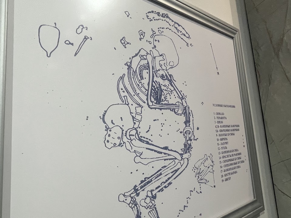 サラズム遺跡のハイライトの一つが、発掘された「サラズムの王女」の遺骨です。 驚くべきことに、この女性は非常に背が高く(約2m)、豪華な装飾品と共に埋葬されていました。