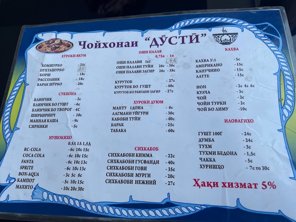 正直なところ… 付け合わせのポテトはかなりの油分で、残念ながら食べきれませんでした。ウズベキスタンもタジキスタンも予想以上に油っこい料理が多く、この頃には胃腸がお疲れモードです(笑)。