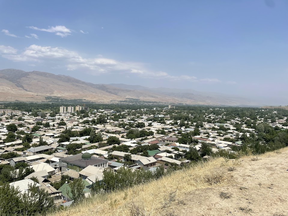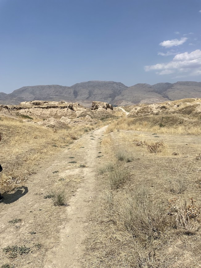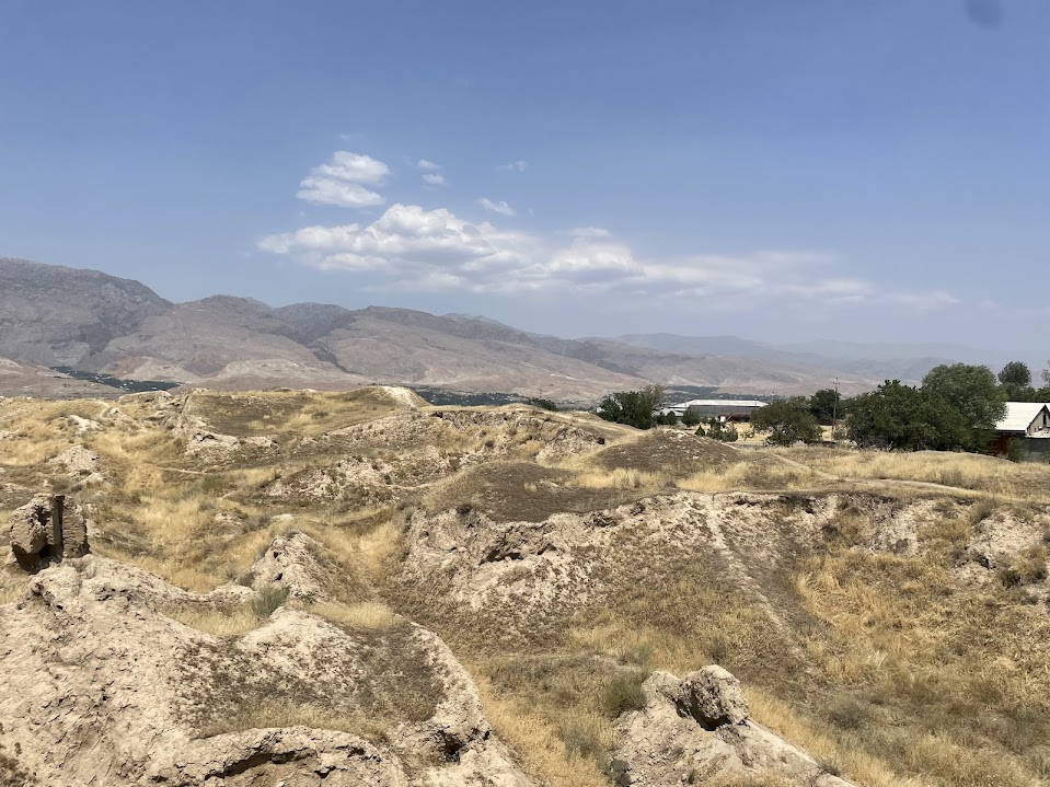 遺跡の土壁の向こうには、雄大なトルキスタン山脈やザラフシャン山脈が広がります。歴史的な遺跡と中央アジアの壮大な大自然が一体となった景色は、非常に印象的でした。