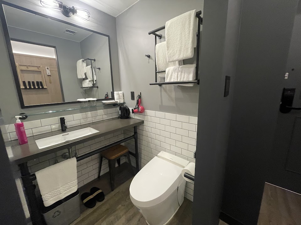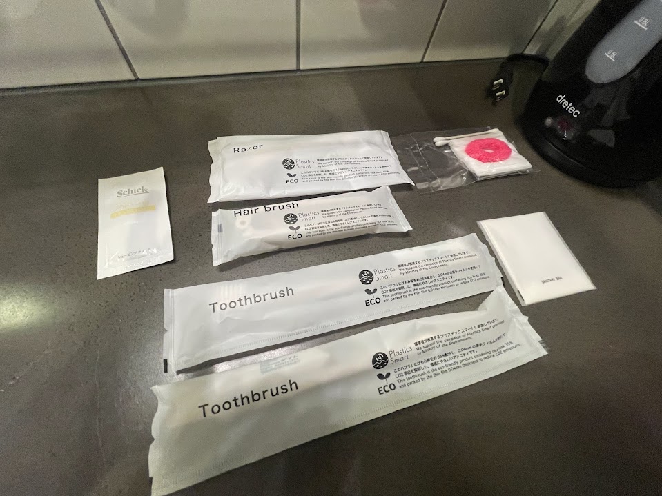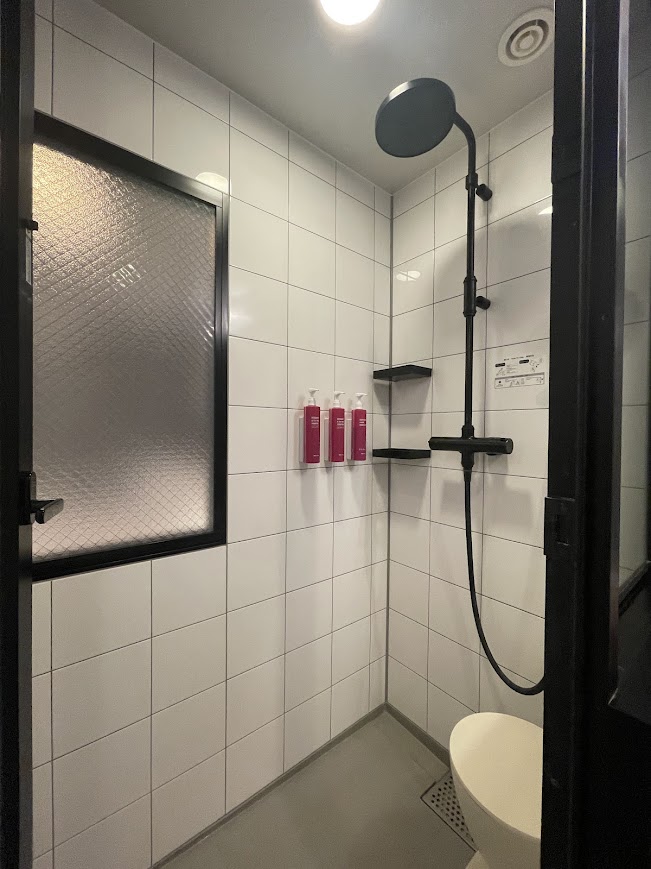 バスルームも機能的でコンパクト。ただし、バスタブはなく、シャワーブースのみの造りとなっている点にはご注意ください。シャワーの水圧は十分で快適でした。また、歯ブラシなどの最低限のアメニティは一通り揃っているため、手ぶらで宿泊しても安心です。