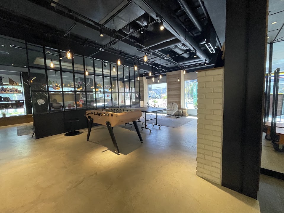 大小さまざまなテーブル、ソファ、そしてゲーム台などが配置されており、読書をする人、PCで仕事をする人、友人とおしゃべりを楽しむ人など、思い思いの時間を過ごしています。