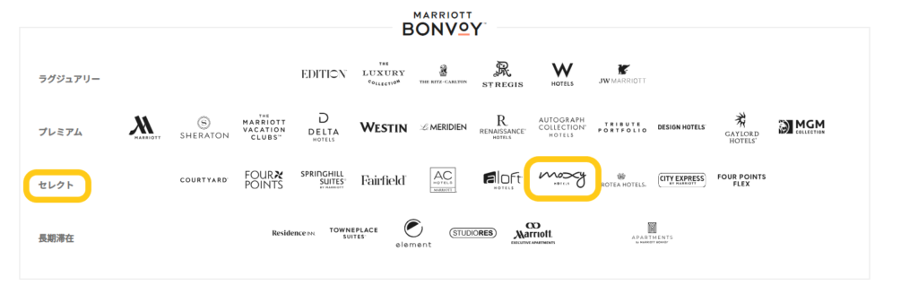 モクシーはマリオット系列の中でも「セレクト」タイプに位置しています。
