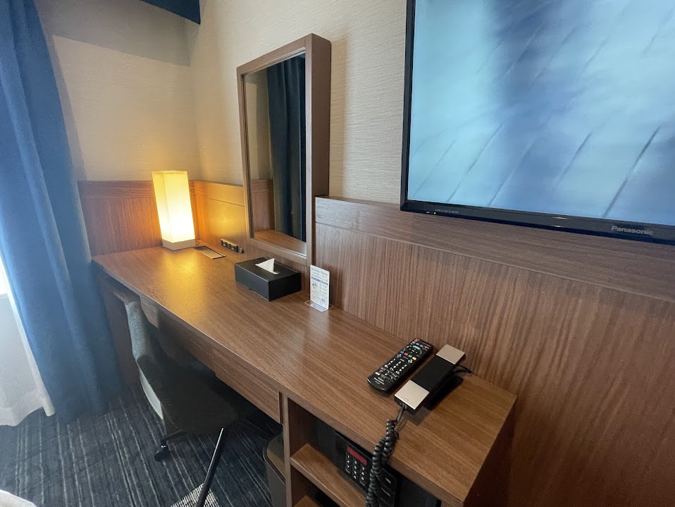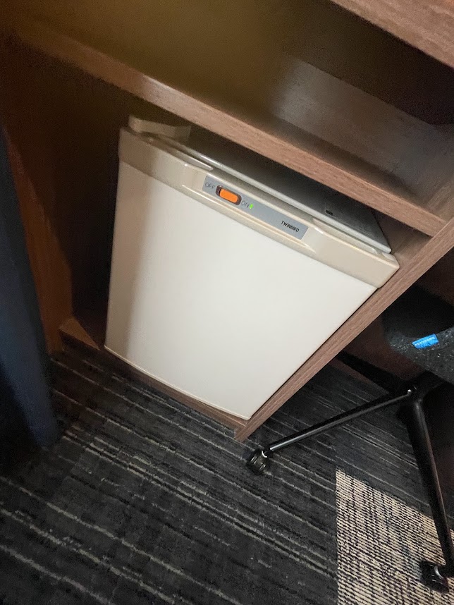 ベッドは、幅140cmのダブルベッドが設置されています。2人で寝るには少々狭さを感じるかもしれませんが、機能性を重視したビジネスや観光の拠点としては十分な快適性です。デスク、薄型テレビ、ミニ冷蔵庫などがコンパクトに配置され、限られた広さの中で機能性と快適性を両立させています。