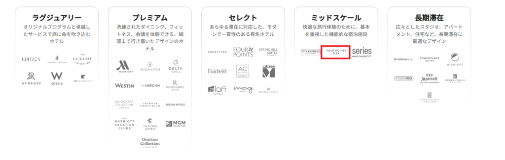 「フォーポイント フレックス by シェラトン」は、マリオット・インターナショナルの中でも「ミッドスケール」(中価格帯)に位置するブランドです。