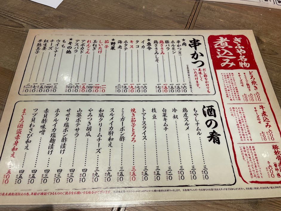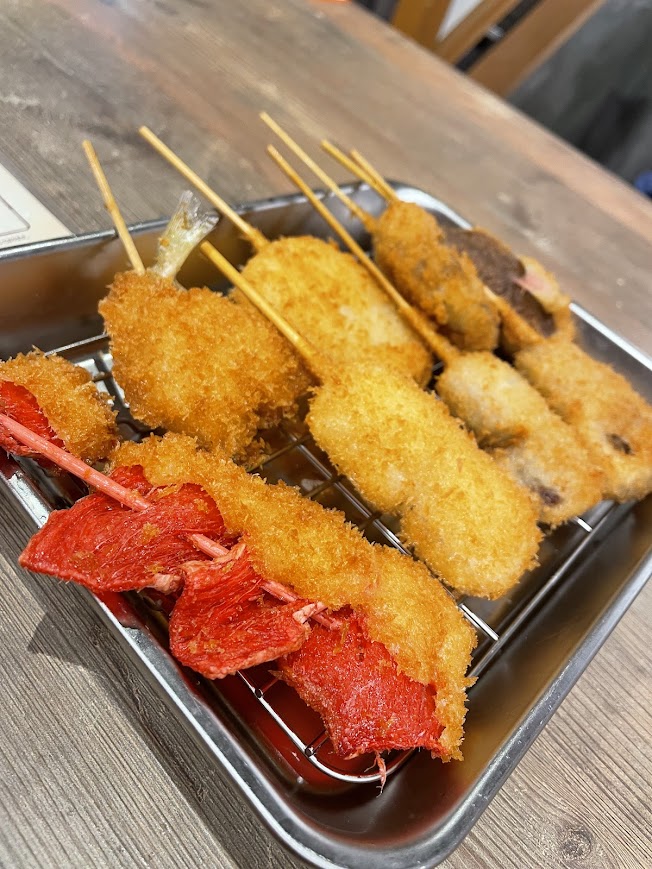 - 串かつ(121円〜): 衣がサクサクで、何本でも食べられてしまいます。