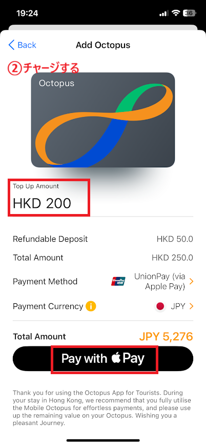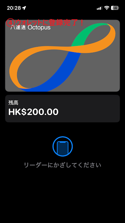 iPhoneの方は、日本にいるうちにアプリで登録を済ませておくのが断然おすすめ。 「Octopus for Tourists」というアプリをダウンロードし、Apple Pay経由でチャージするだけで、スマホがそのままオクトパスカードになります。