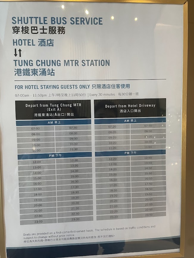ホテルまでは、空港や最寄りのMTR東涌駅から無料のシャトルバスが運行されています。