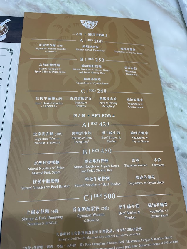 ビクトリアピークで絶景を堪能したあとは、ピーク・タワー内にある老舗へ。ここの特徴は、麺が伸びる前に一番美味しい状態で食べきれるよう、器が少し小ぶりなこと。今回は「200香港ドルの2名セット」をチョイスしました。