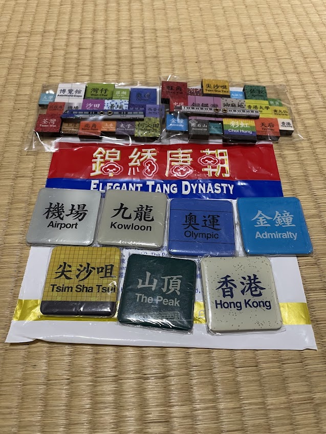 香港の地下鉄(MTR)といえば、駅ごとに色が違う鮮やかなタイルの壁が有名ですよね。そのデザインを再現したマグネットをゲットしました!自分が訪れた駅のカラーを探すのが楽しくて、ついつい集めたくなっちゃいます。