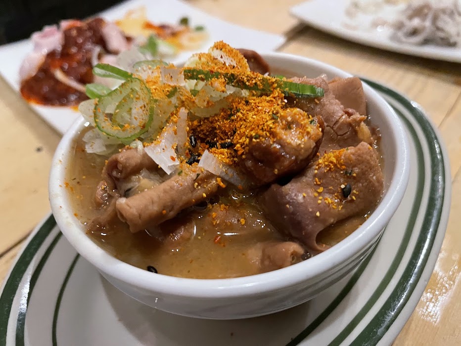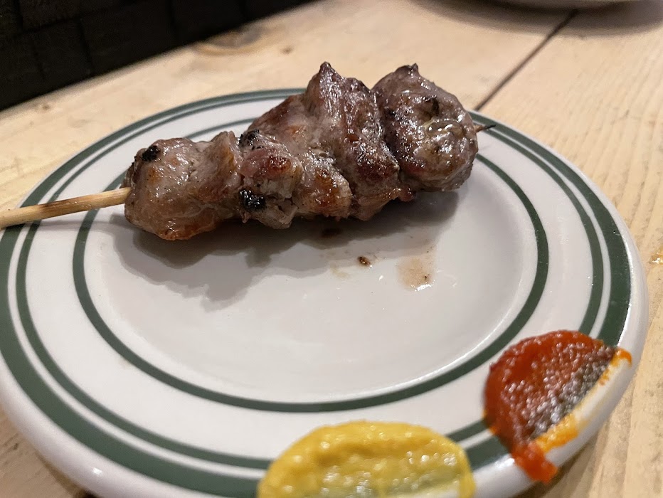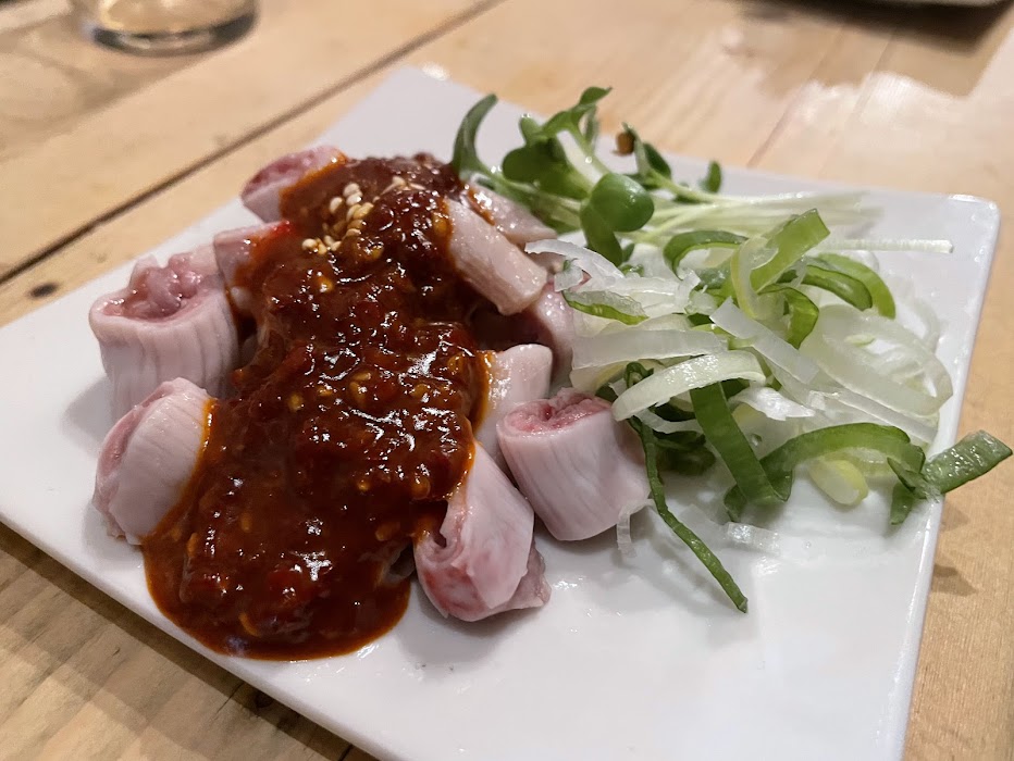 まず運ばれてきたのは、目にも鮮やかな「白センマイ」と、今回一番の衝撃を受けた「コブクロ刺し」。 このコブクロ、コリコリとした鮮烈な食感はもちろんですが、絡められたちょい辛のタレがとにかく絶品! お酒との相性が良すぎて、気づけば皿が空になり、迷わずおかわりを注文してしまったほどです。